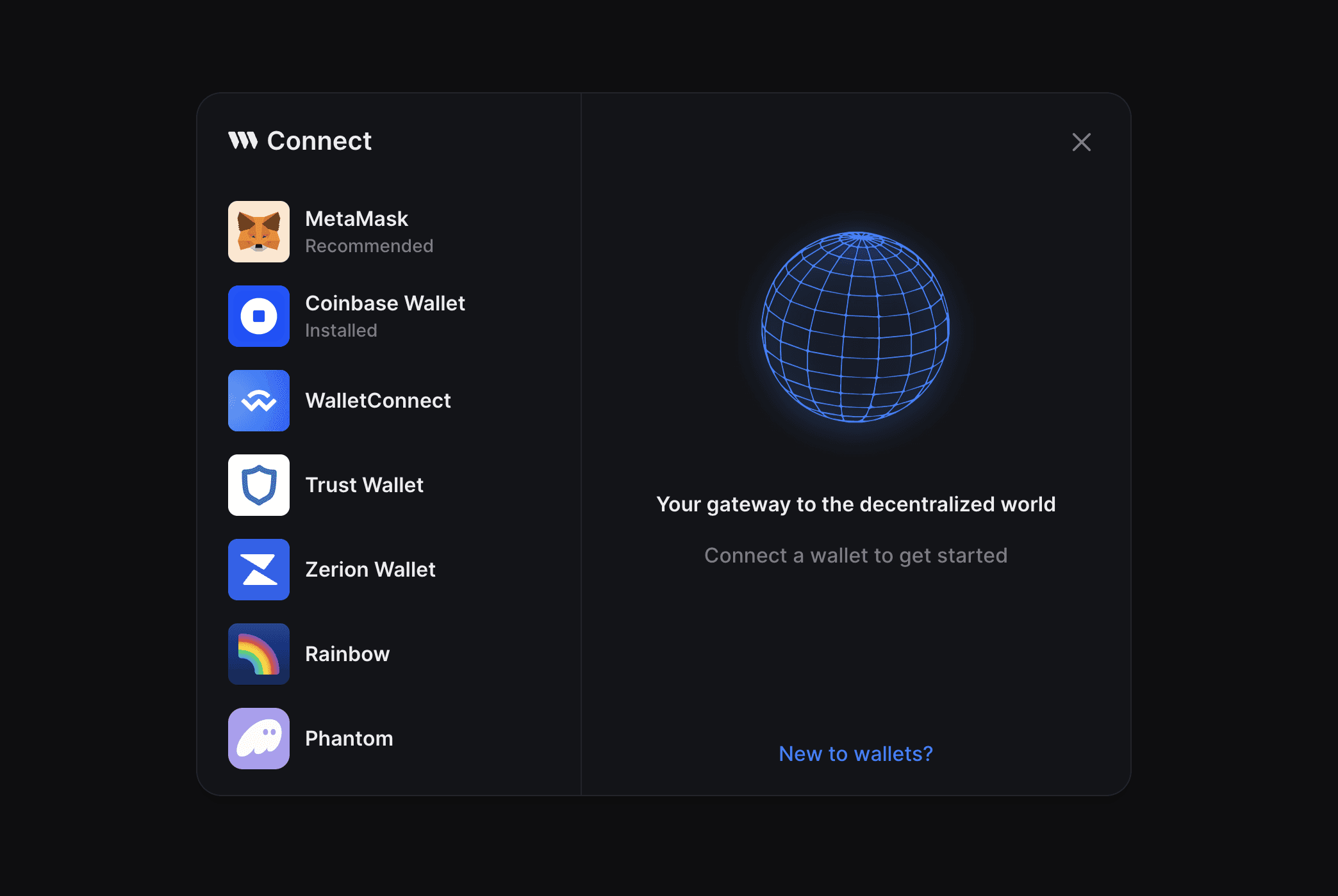 ConnectWallet component renders a button which when clicked opens a modal to allow users to connect to various wallets. It is extremely customizable and very easy to use.